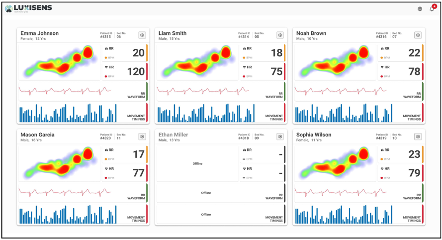 To begin with, three algorithms has being developed for monitoring respiration rate, heart rate, and movements. These metrics are collected and presented in a user-friendly UX/UI design. Additionally, this data can be displayed in multiple formats to facilitate effective central monitoring.